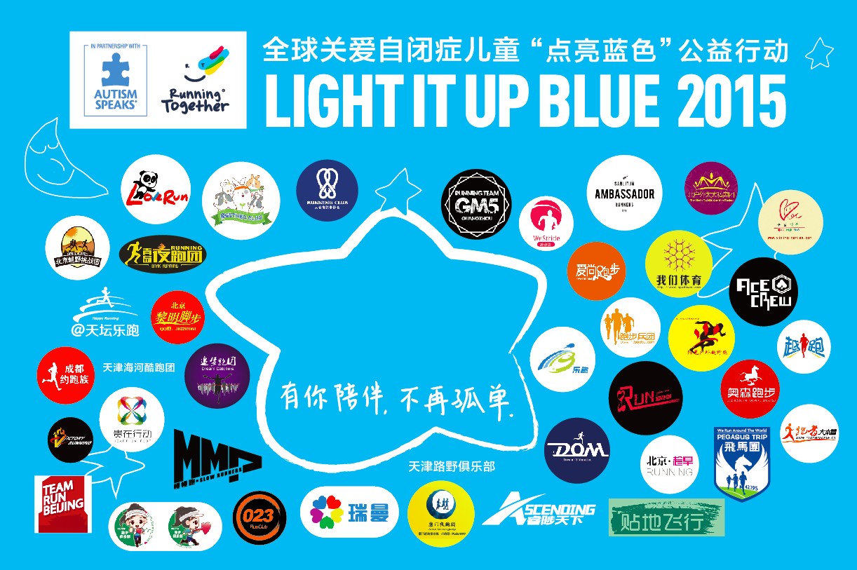4月2日,美国最大的自闭症非盈利组织AUTISM SPEAKS和中国第一个为帮助自闭症儿童而设立的跑步赛事Running Together国际迷你马拉松,联合全国爱心跑团共同发起“让我陪你一起跑”2015 全球关爱自闭症儿童“点亮蓝色”公益行动。